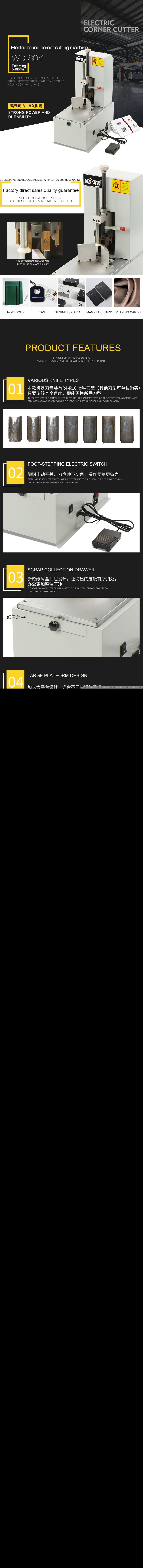 As a core product in our line, this electricity-powered device provides precision and efficiency that's hard to match. With the Corner Cutter WD-80Y, you are assured of fast, flawless cuts every time without compromising the quality of your materials. This is the ideal device for a range of applications, from bookbinding, paper crafting, and even in commercial printing.