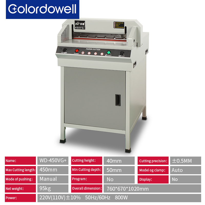 Unleash a new level of efficiency with Colordowell's WD-450VG+, the advanced electric paper cutting machine perfect for smooth and effortless operations. Designed to enhance your productivity, this power-packed machine is the brainchild of Colordowell - a renowned supplier and manufacturer committed to delivering robust and high-performance products.